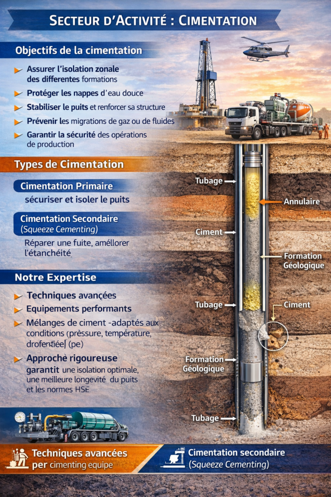 Elle consiste à pomper du ciment dans l’espace annulaire entre le tubage (casing) et la formation géologique afin d’assurer l’intégrité, la sécurité et la durabilité du puits.
