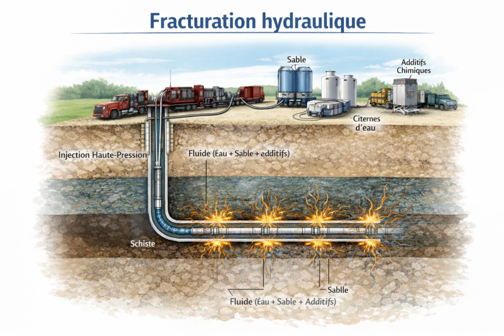 Elle consiste à injecter un fluide sous haute pression dans la formation géologique afin de créer ou d’élargir des fractures, facilitant ainsi l’écoulement des hydrocarbures vers le puits.