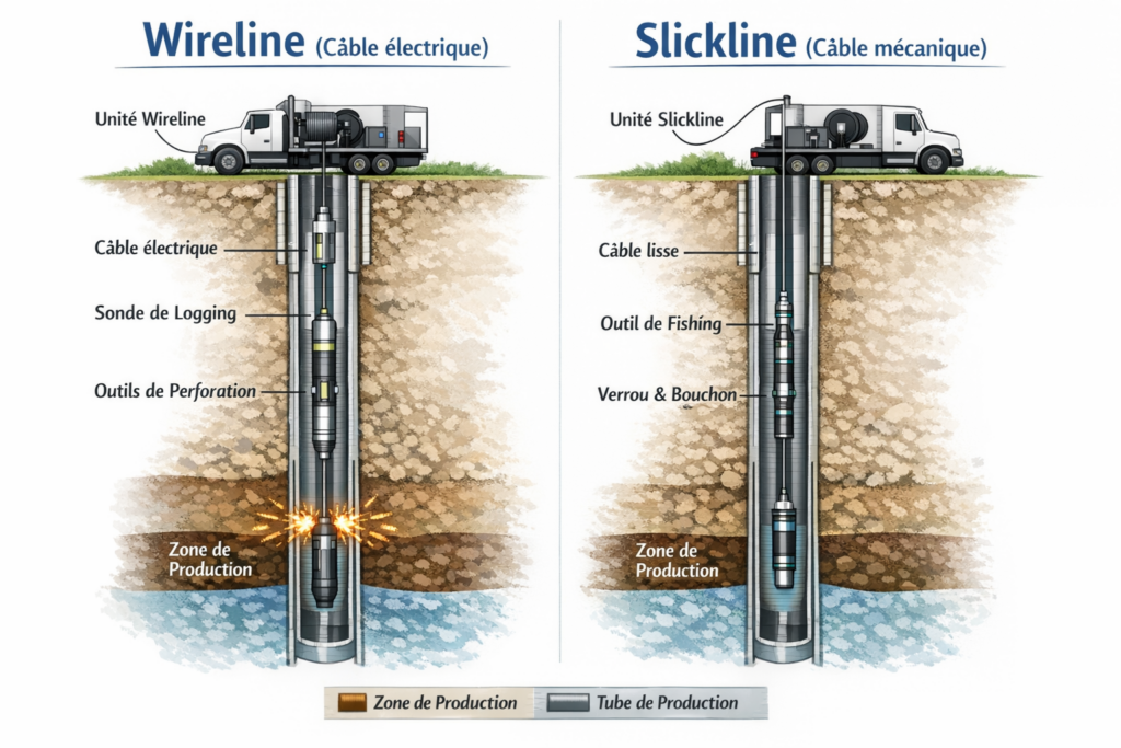 Regroupe les services d’intervention sur puits pétroliers et gaziers à l’aide de câbles spécialisés, permettant d’effectuer des opérations techniques sans retirer les équipements majeurs du puits.